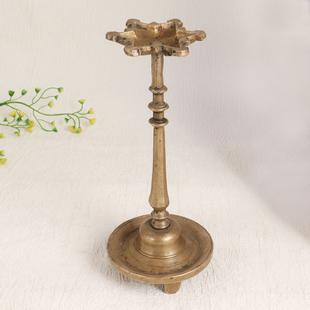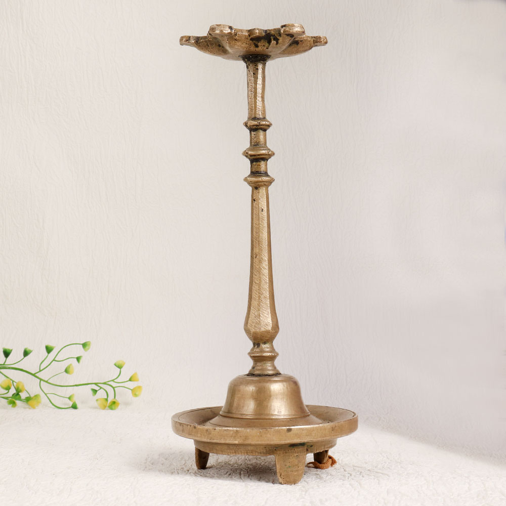 This Vintage Brass Oil Lamp is a timeless masterpiece that embodies the rich heritage of South Indian craftsmanship. Handcrafted with precision and care by skilled Indian artisans, this exquisite lamp showcases the intricate details of South Indian Art. Crafted from high-quality brass, this lamp boasts an antique brown finish that exudes warmth and character. Featuring six flame holders, it can be lit simultaneously using traditional fuels like mustard oil or desi ghee, paired with cotton wicks. This versatile lamp serves as a captivating addition to any setting, be it at home, in the office, a restaurant, hotel, cafe, or shop. Its soft, ambient glow not only elevates the atmosphere but also adds a touch of old-world charm. Perfect for enhancing the spirituality of your prayer room or temple, this lamp radiates a divine aura during religious rituals. It's also an ideal addition to your vintage collection or exhibition display, showcasing the artistry of a bygone era. Celebrate special, festive, or auspicious occasions by gifting this Vintage Brass Oil Lamp to your loved ones. It's a symbol of tradition, art, and the enduring beauty of Indian craftsmanship.