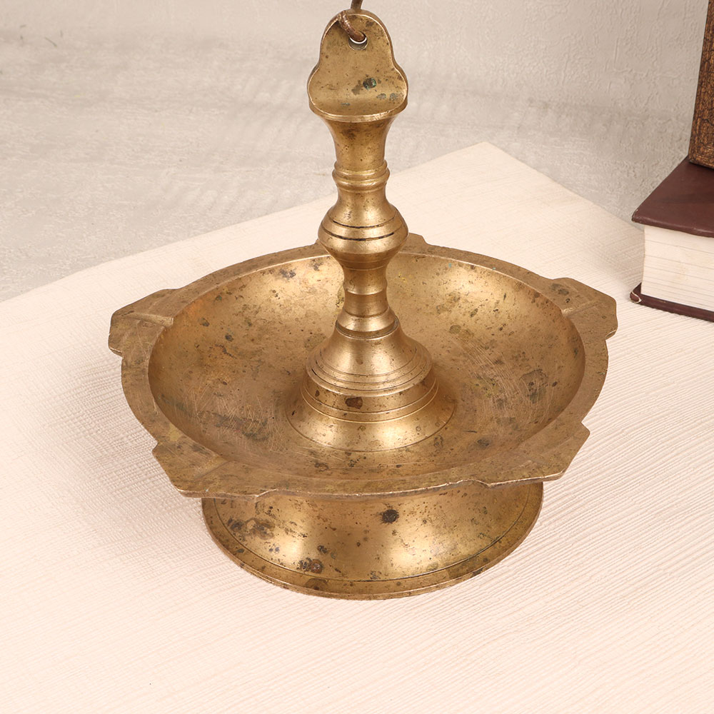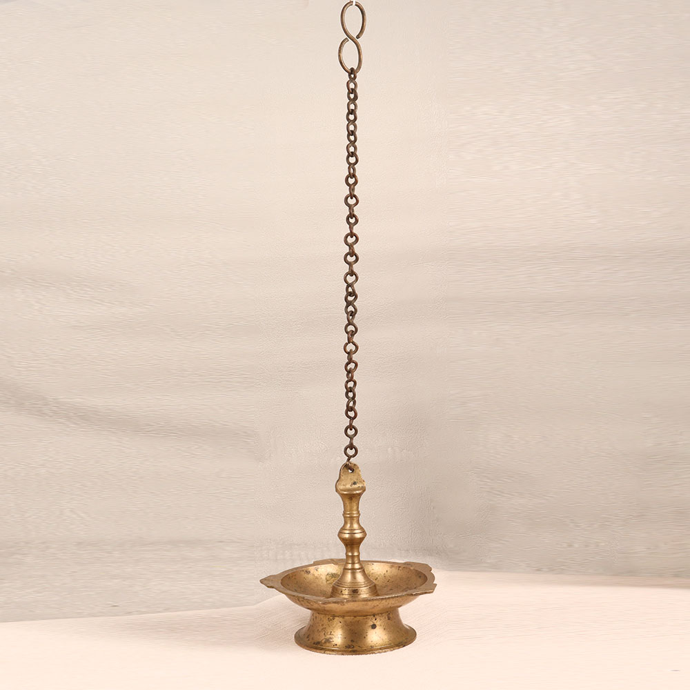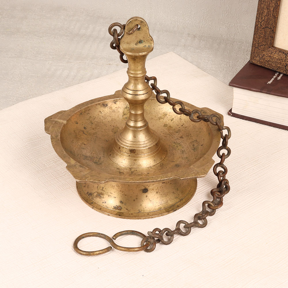 Enhance the ambiance of your space with our exquisite Vintage Brass Hanging Oil Lamp. This timeless piece with an antique brown finish is a symbol of craftsmanship and heritage. Handmade by highly skilled Indian artisans specializing in South Indian Art, this lamp is crafted from high-quality brass, ensuring durability and authenticity. Designed to hold five jyots simultaneously, the lamp allows you to illuminate your surroundings with the warm glow of mustard oil or ghee using cotton wicks. Light it during special occasions, auspicious events, or prayer sessions to create a serene atmosphere that radiates positive vibes. Versatile and elegant, this hanging oil lamp is suitable for various settings, including homes, offices, restaurants, hotels, cafes, and prayer rooms. Enhance your vintage collection or gift this masterpiece to your family, friends or relatives on special, festive, or auspicious occasions. Embrace tradition and artistry with this unique piece that transcends time and culture.