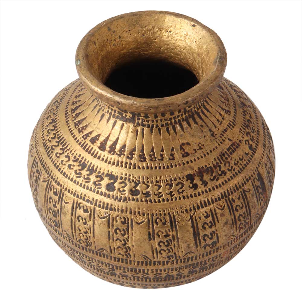 A circular decorative brass water jar that holds drinking water has been expertly engraved with hand-crafted artwork throughout. Excellent hand carving work produced by skilled artisans. Decorate your kitchen with it or place it beside your dining area as a display unit. On a coffee table, it can also serve as a flower container.