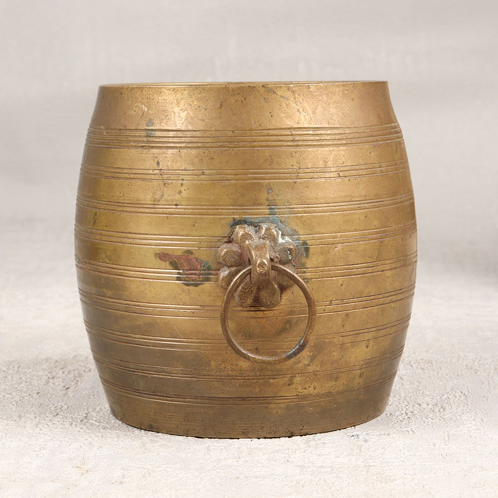 This Vintage Brass Rice Measurement Bowl with two handles is a timeless piece that embodies the rich cultural heritage of South Indian Art. Handcrafted by highly skilled artisans, this unique bowl was traditionally used for measuring rice and dal in the culinary rituals of South Indian households. The bowl's antique brown finish adds a touch of nostalgia, reminiscent of bygone eras. Forged from high-quality brass, this meticulously crafted piece showcases the artistry and craftsmanship of the region. The two handles enhance both its aesthetic appeal and functional design, making it a distinctive addition to any setting. While this vintage bowl is no longer recommended for its original purpose, its antique charm makes it a perfect decorative item for homes, offices, restaurants, hotels, or cafes. Placed as a centerpiece or as part of a vintage collection, it exudes a sense of history and cultural significance. Ideal for special occasions, festivals, or auspicious celebrations, this unique bowl also makes for a thoughtful and meaningful gift for your family, friends or relatives. Embrace the elegance of the past with this Vintage Brass Rice Measurement Bowl that is a true testament to the enduring beauty of handmade craftsmanship.