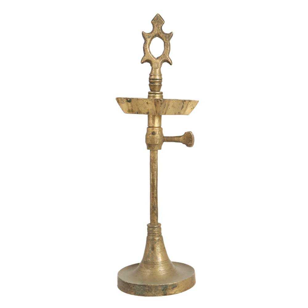 A brass oil lamp in a unique shape with 5 jyots. An incredible piece of art to place in your prayer room or living room to add an alluring look to the interior. Light this oil lamp with mustard oil or ghee and 5 cotton wicks and it will add a seductive look to the interior. It has a joint to adjust its height. Use this sturdy oil lamp during power outages or family gatherings to add an aesthetic flair to the decor. Place it in your restaurant, hotel or shop prayer room and use it during morning and evening prayers. It is made by skilled Indian artisans from South India in antique brown colour. Gift it to your family, friends or relatives on special occasions or festive occasion.