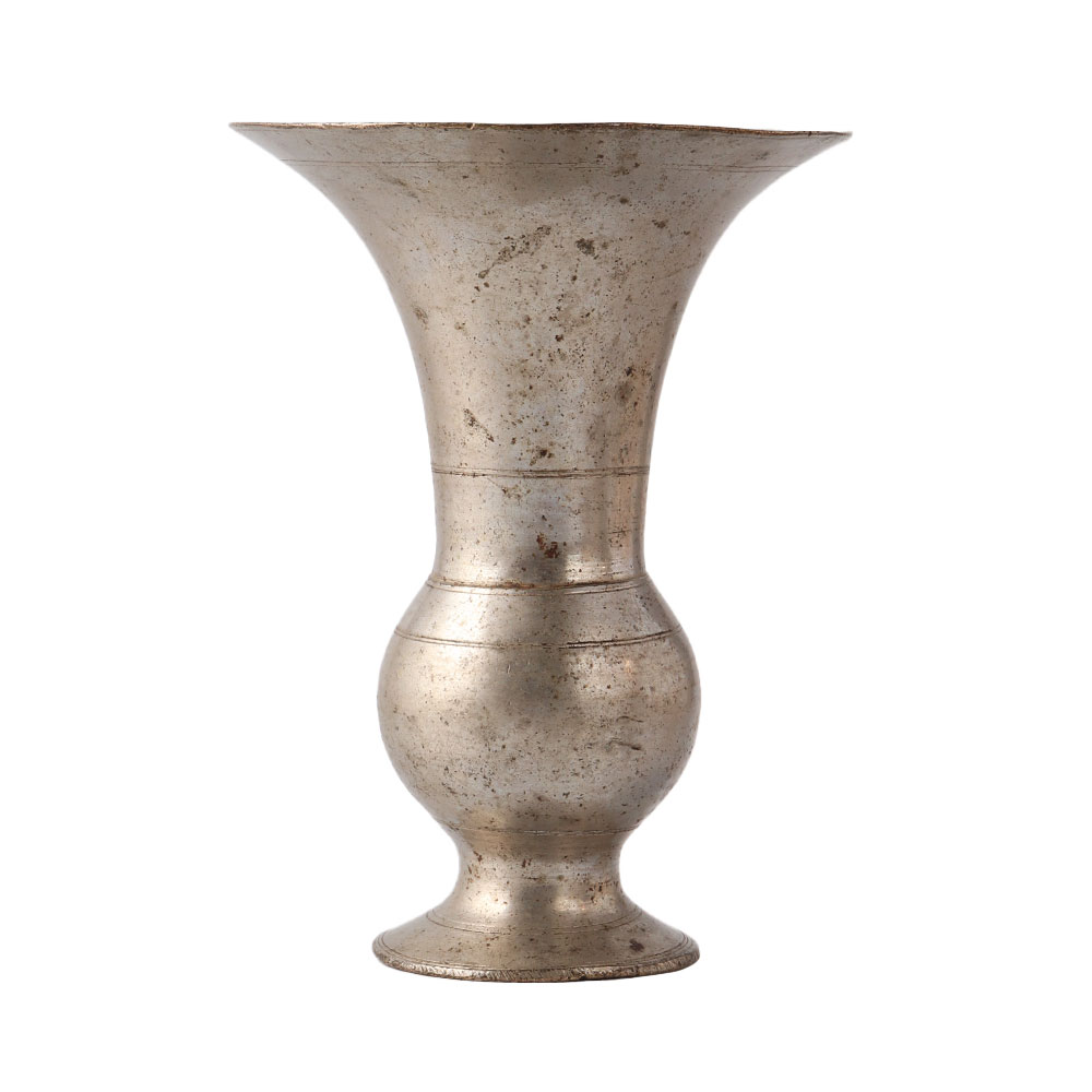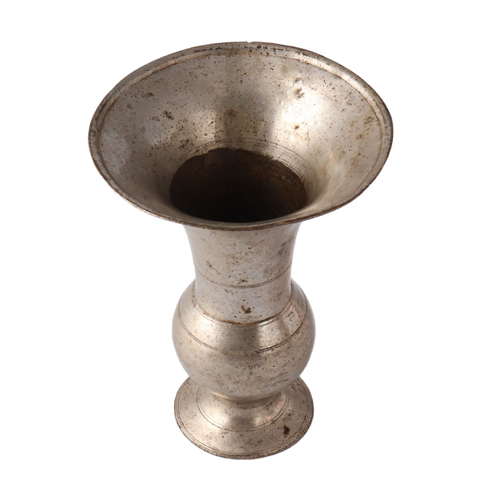 This tall cuspidor, also known as an ancient brass spitoon, is from Kerala and has a tall, flared neck on a baluster-shaped body and a round, spreading foot. There are two rings on the lip's underside. For chewing tobacco or betel nuts, bronze has a black patina. However, this container would make a great vase or decorative item. It comes in a lovely silver finish.