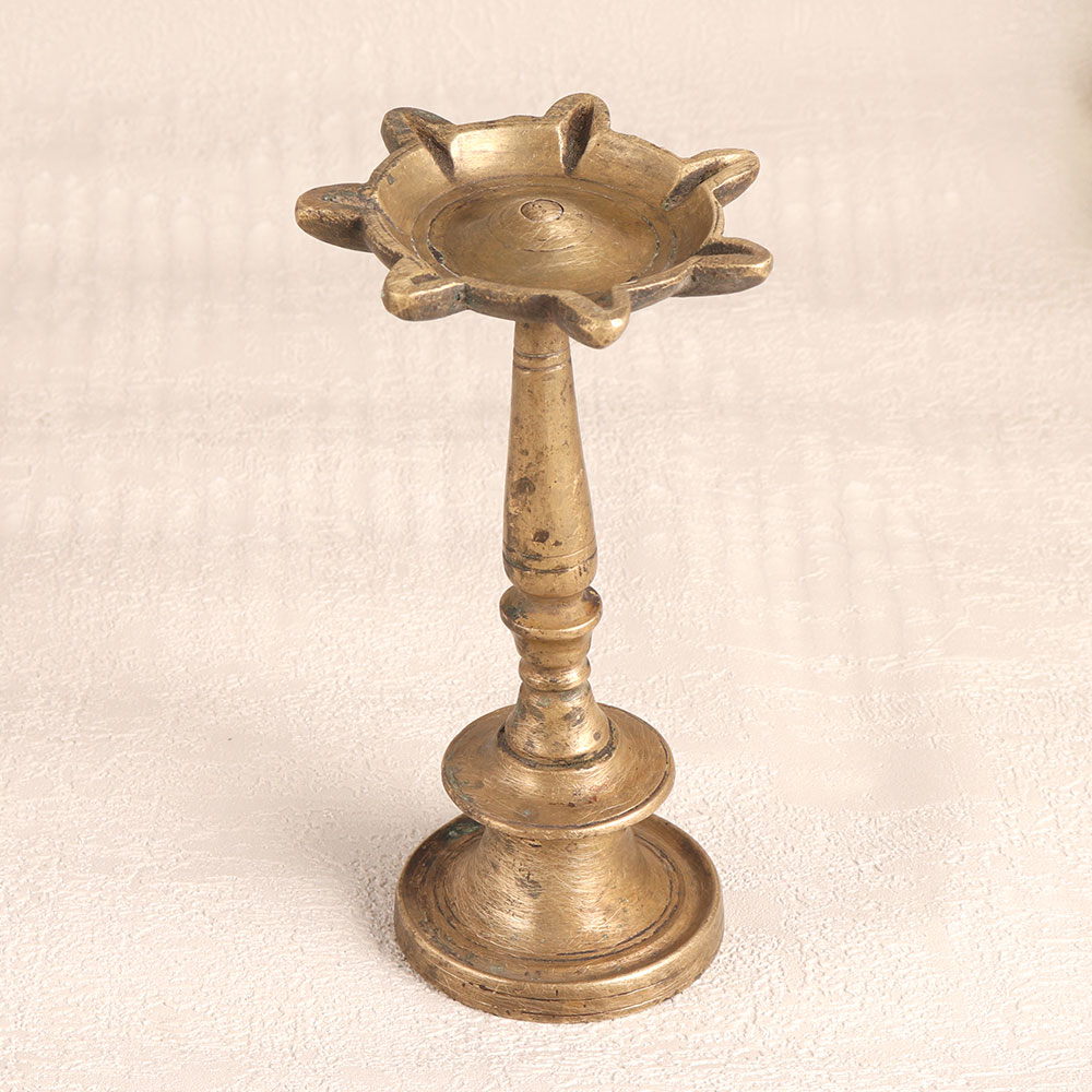 Adorn your ambiance with the timeless allure of our Vintage Brass Oil Lamp with 7 Jyots. This exquisite piece harks back to a bygone era, carefully handcrafted by highly skilled and experienced Indian artisans following the traditions of South Indian Art. Crafted from premium brass, it boasts an antique brown finish that exudes an aura of classic elegance. The lamp's seven jyots provide a radiant glow when ignited with mustard oil or ghee and cotton wicks, casting a warm, inviting light. This versatile piece is a splendid addition to any setting, be it your home, office, hotel, cafe, shop, or restaurant prayer room. Its intricate design makes it perfect for decorative purposes and an invaluable addition to any vintage collection or exhibition display. Beyond aesthetics, this lamp holds cultural and spiritual significance, making it ideal for use during prayers or auspicious occasions. It also serves as a thoughtful and meaningful gift for your family, friends or relatives during special festivals or moments of significance. Embrace the heritage, craftsmanship, and warmth of this Vintage Brass Oil Lamp, and let it infuse your space with a touch of timeless beauty.