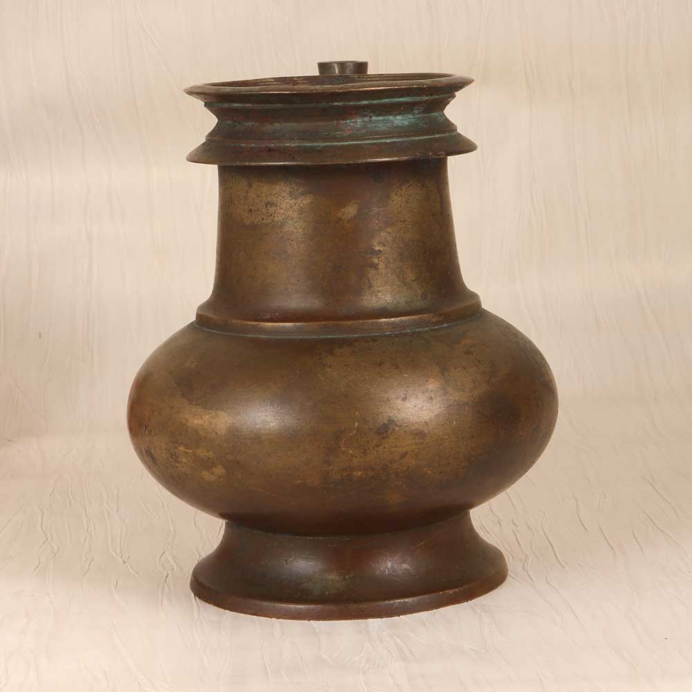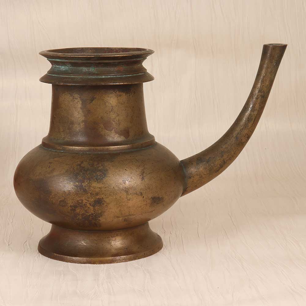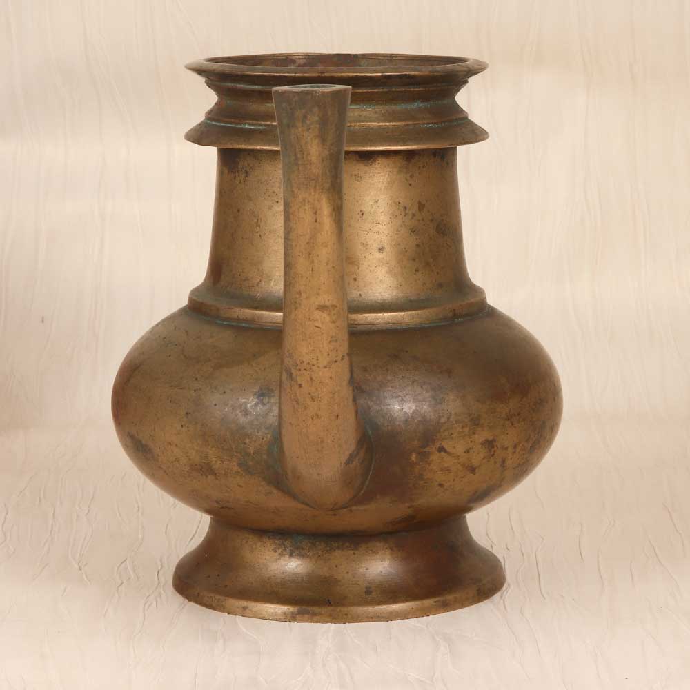 Sanctify your space with this vintage brass holy water pot, handcrafted in the style of South Indian sacred art. Its simple brown patina and elegant pouring spout give understated beauty to ancient ritual. Keep this pot near your prayer corner, ready to bless yourself during devotion. Let it bring ritual and connection to your spiritual practice. Dip your fingers in the cool, holy water and receive the calm it brings as you mark your forehead. Center your mind on what matters most. Give this vintage pot to a spiritual loved one. They'll appreciate its timeless form elevating their daily rituals. A thoughtful way to share the gift of mindful tradition.