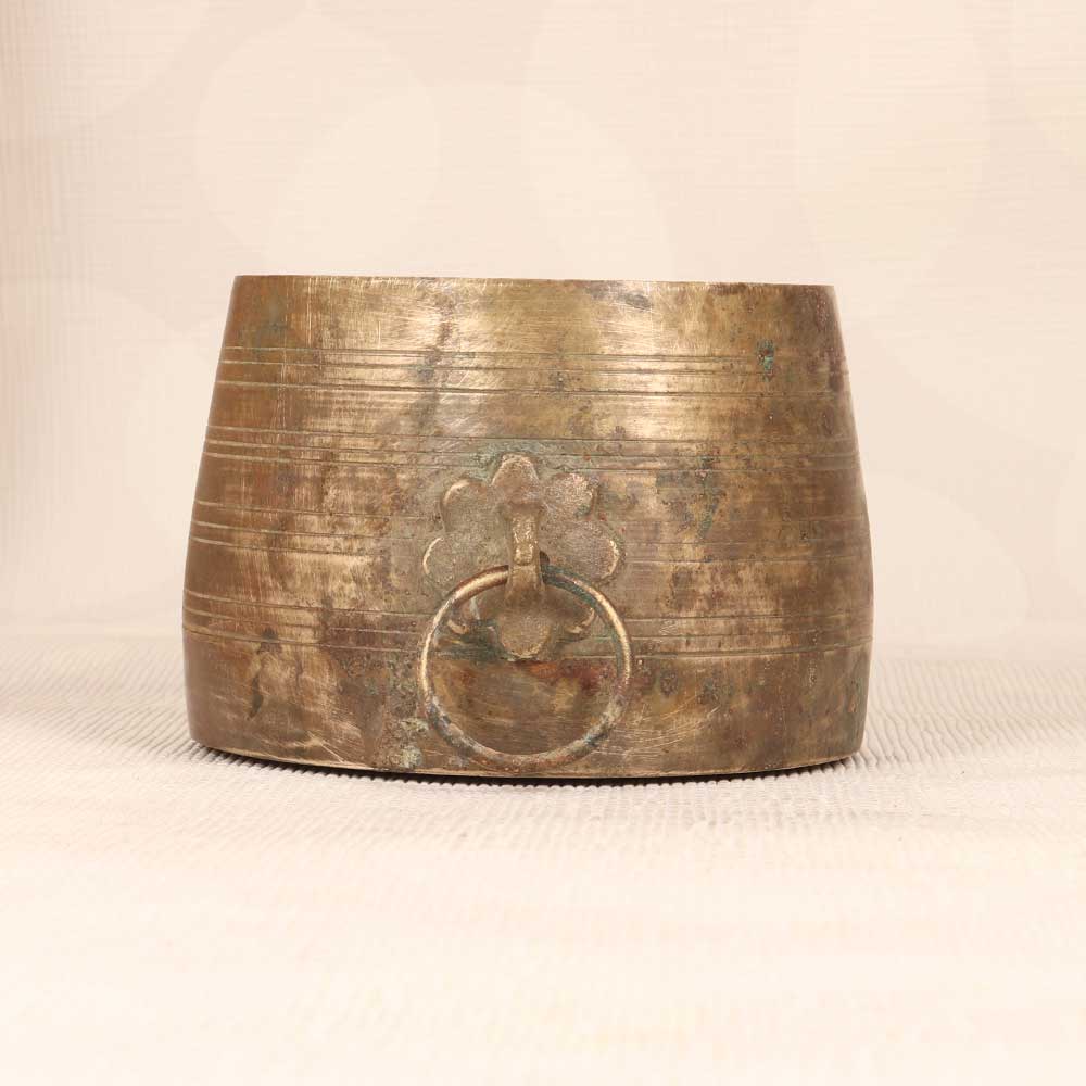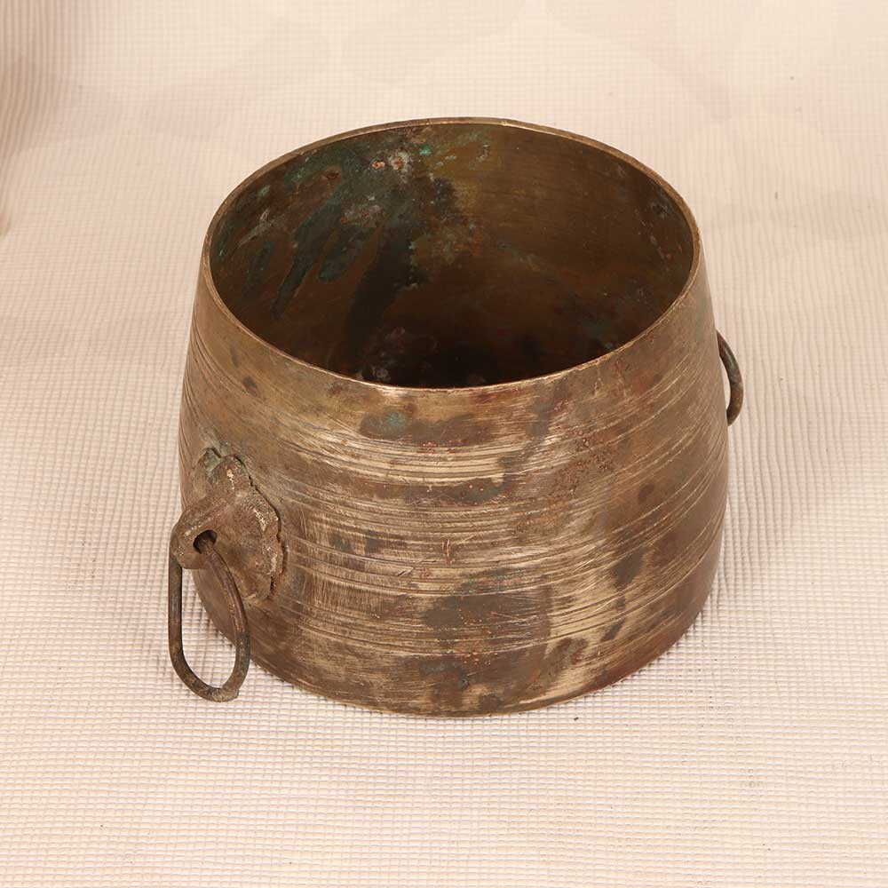 Step back in time with the vintage brass measurement bowl. This antique bowl was handcrafted in South India for portioning rice before cooking. Its hammered brass exterior and engraved measurements provide a window into the past. The pleasing patina and heft of solid brass make this an impactful accent piece. Display it in your living room or entryway to lend an exotic, rustic vibe. Its artisanal look adds cozy character ideal for farmhouse or vintage decors. Though not intended for current food use, this brass bowl remains a decorative find. Place it on your coffee table or kitchen island to infuse your home with old world charm. Let its hand hammered texture and exotic origins inspire your interior design.