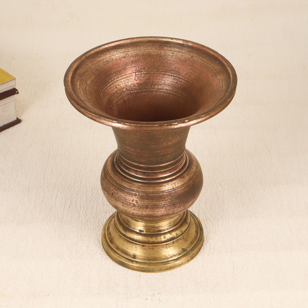 Adorn your interior with the timeless charm of our Vintage Brass Flower Pot which is a true masterpiece crafted by talented Indian artisans in the intricate style of South Indian Art. The pot boasts a rich antique brown finish, adding a touch of old-world elegance to any space. Handmade with precision and care, this exquisite piece is a testament to the artistry passed down through generations. Made from high-quality brass, the flower pot is not just a decorative item but a symbol of craftsmanship and heritage. Its versatile design makes it suitable for various settings, whether adorning your home, office, restaurant, hotel, or cafe. The warm, earthy tones and ornate detailing make it a captivating addition to vintage collections. This unique flower pot isn't just a statement piece but also a thoughtful gift for your family, friends or relatives on special, festive, or auspicious occasions. Its classic design transcends trends, ensuring a timeless appeal that will be cherished for years to come. Bring a touch of South Indian artistry and a sense of history into your surroundings with this Vintage Brass Flower Pot.