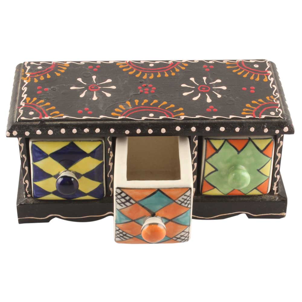 Spice Box-1410 Masala Rack Container Gift Item. Ceramic Drawers in Wooden Frame. The Spice Boxes are designed with different patterns. These boxes are made using natural wood which does not harm the purity of spices.