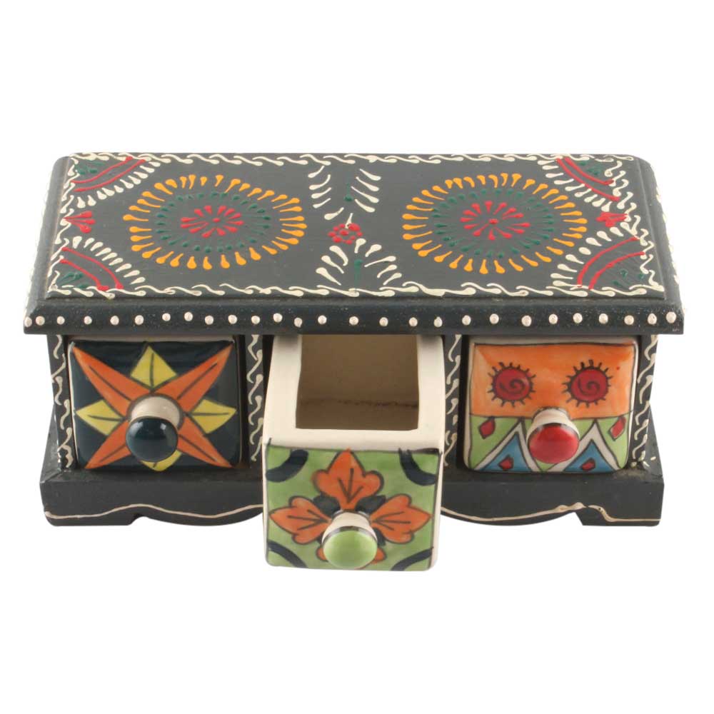 Spice Box-1416 Masala Rack Container Gift Item. Ceramic Drawers in Wooden Frame. The Spice Boxes are designed with different patterns. These boxes are made using natural wood which does not harm the purity of spices.