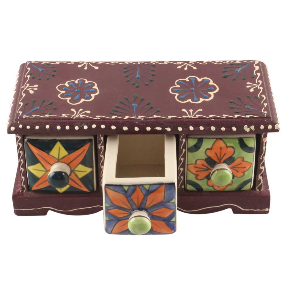 Spice Box-1417 Masala Rack Container Gift Item. Ceramic Drawers in Wooden Frame. The Spice Boxes are designed with different patterns. These boxes are made using natural wood which does not harm the purity of spices.