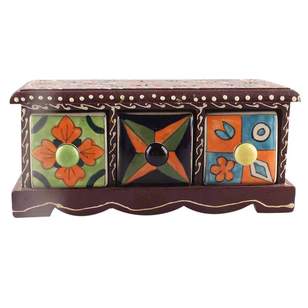 Spice Box-1437 Masala Rack Container Gift Item. Ceramic Drawers in Wooden Frame. The Spice Boxes are designed with different patterns. These boxes are made using natural wood which does not harm the purity of spices.