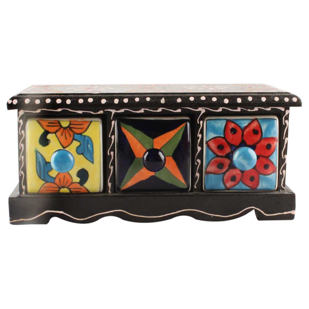Spice Box-1438 Masala Rack Container Gift Item. Ceramic Drawers in Wooden Frame. The Spice Boxes are designed with different patterns. These boxes are made using natural wood which does not harm the purity of spices.