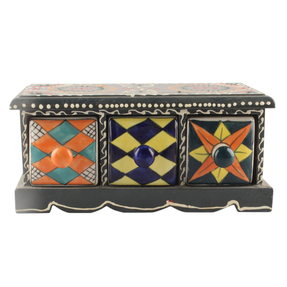 Spice Box-1444 Masala Rack Container Gift Item. Ceramic Drawers in Wooden Frame. The Spice Boxes are designed with different patterns. These boxes are made using natural wood which does not harm the purity of spices.