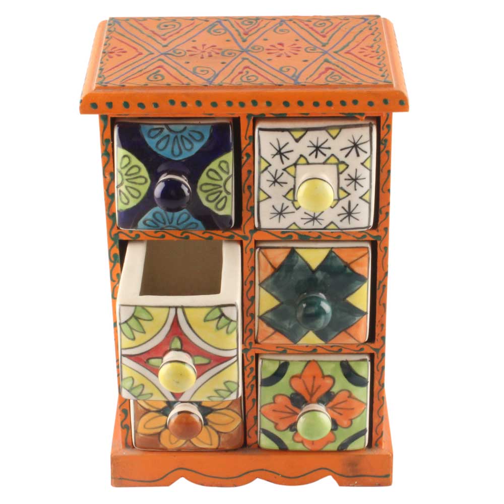 Spice Box-1461 Masala Rack Container Gift Item. Ceramic Drawers in Wooden Frame. The Spice Boxes are designed with different patterns. These boxes are made using natural wood which does not harm the purity of spices.