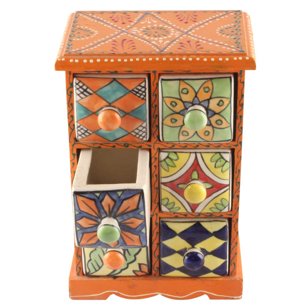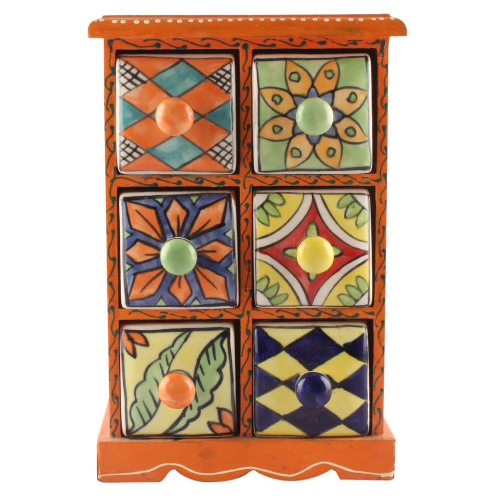 Spice Box-1465 Masala Rack Container Gift Item. Ceramic Drawers in Wooden Frame. The Spice Boxes are designed with different patterns. These boxes are made using natural wood which does not harm the purity of spices.