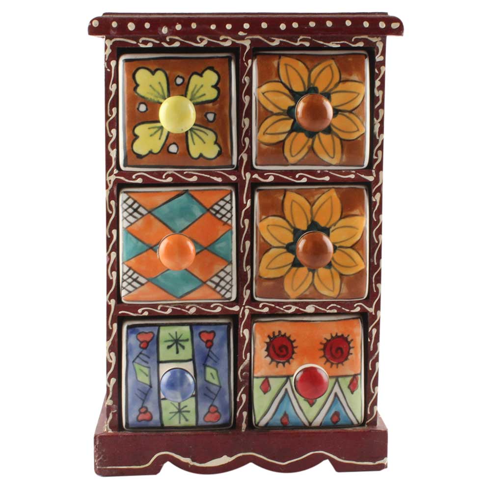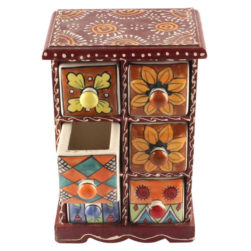 Spice Box-1466 Masala Rack Container Gift Item. Ceramic Drawers in Wooden Frame. The Spice Boxes are designed with different patterns. These boxes are made using natural wood which does not harm the purity of spices.