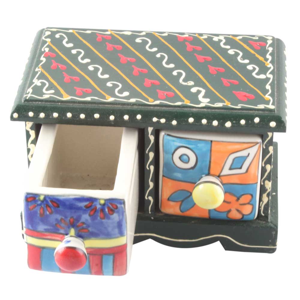 Spice Box-1477 Masala Rack Container Gift Item. Ceramic Drawers in Wooden Frame. The Spice Boxes are designed with different patterns. These boxes are made using natural wood which does not harm the purity of spices.