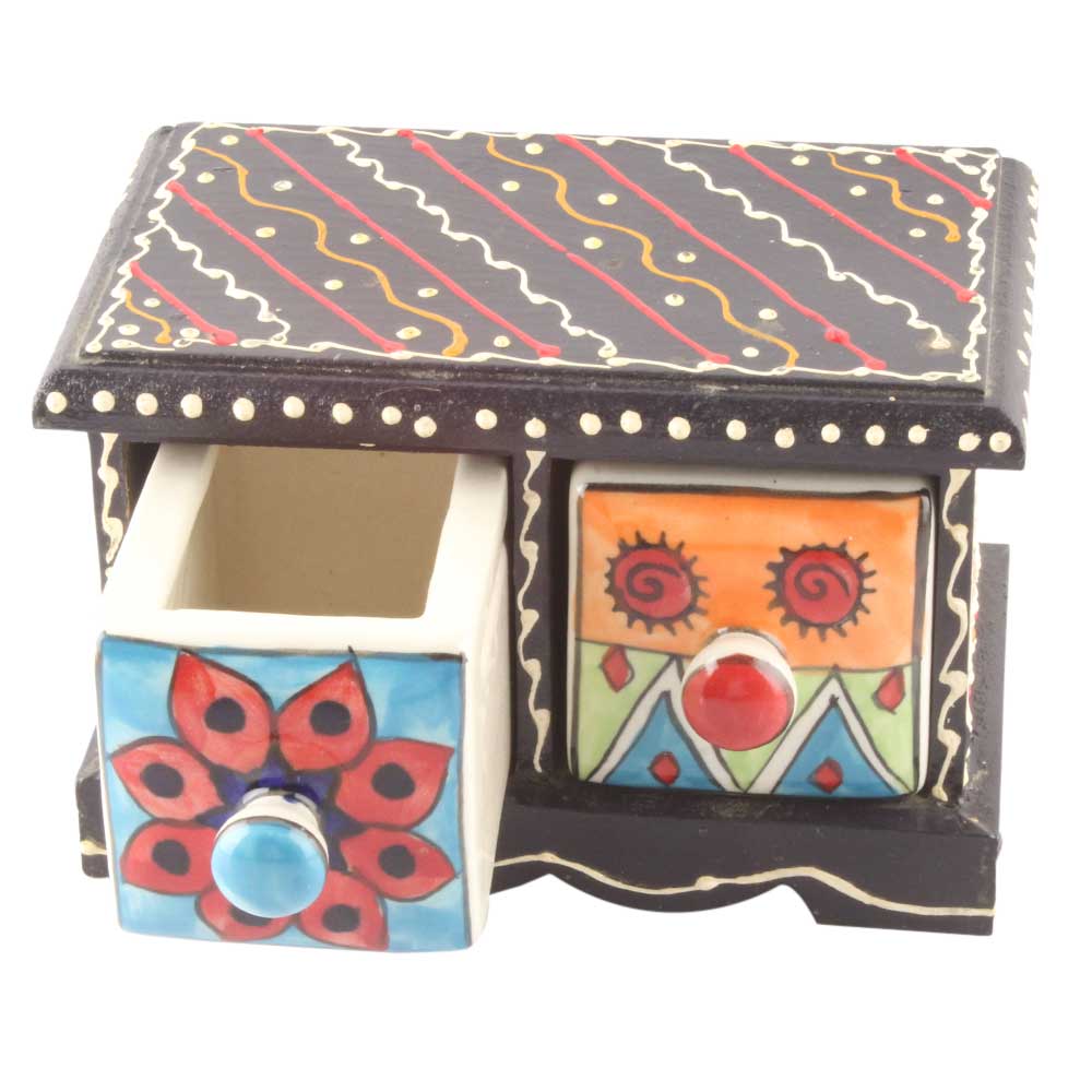 Spice Box-1488 Masala Rack Container Gift Item. Ceramic Drawers in Wooden Frame. The Spice Boxes are designed with different patterns. These boxes are made using natural wood which does not harm the purity of spices.