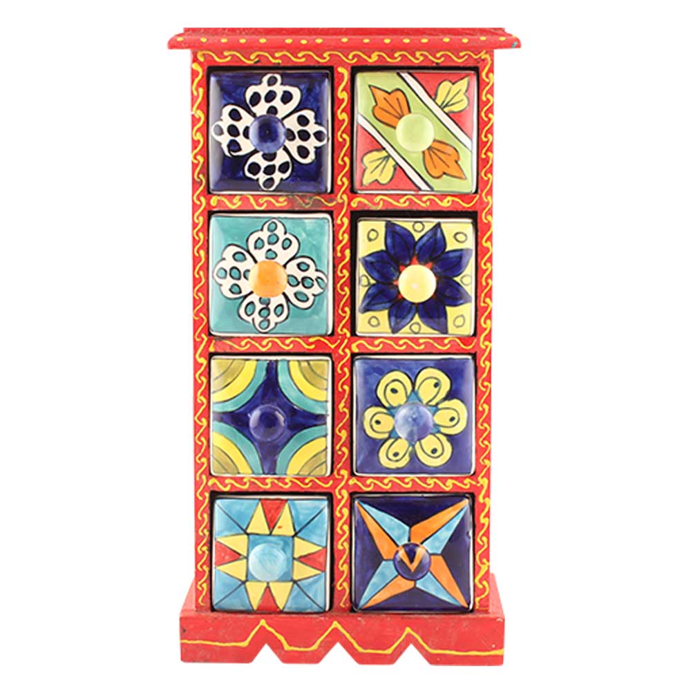 Spice Box-846 Masala Rack Container Gift Item. Ceramic Drawers in Wooden Frame. The Spice Boxes are designed with different patterns. These boxes are made using natural wood which does not harm the purity of spices.