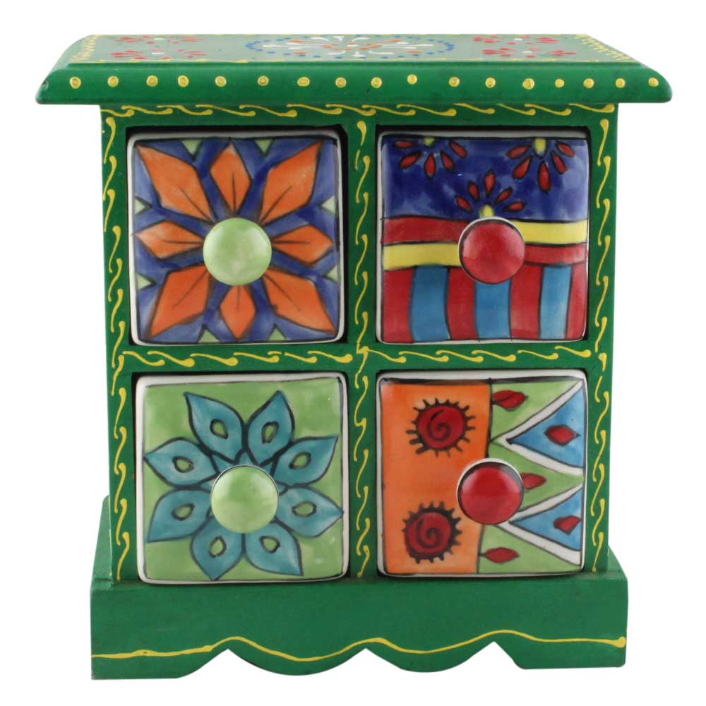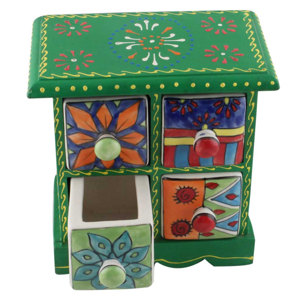 Spice Box-1214 Masala Rack Container Gift Item. Ceramic Drawers in Wooden Frame. The Spice Boxes are designed with different patterns. These boxes are made using natural wood which does not harm the purity of spices.