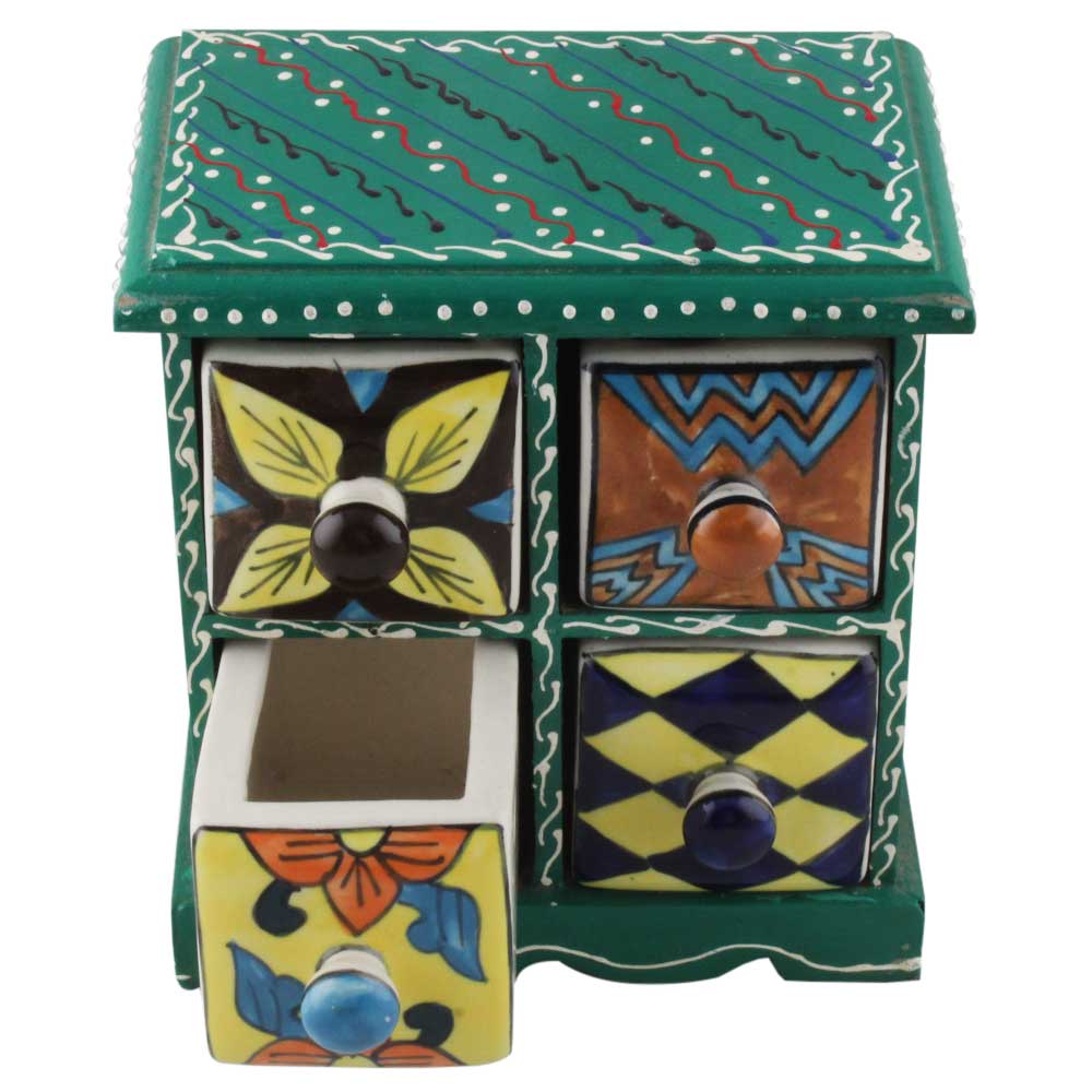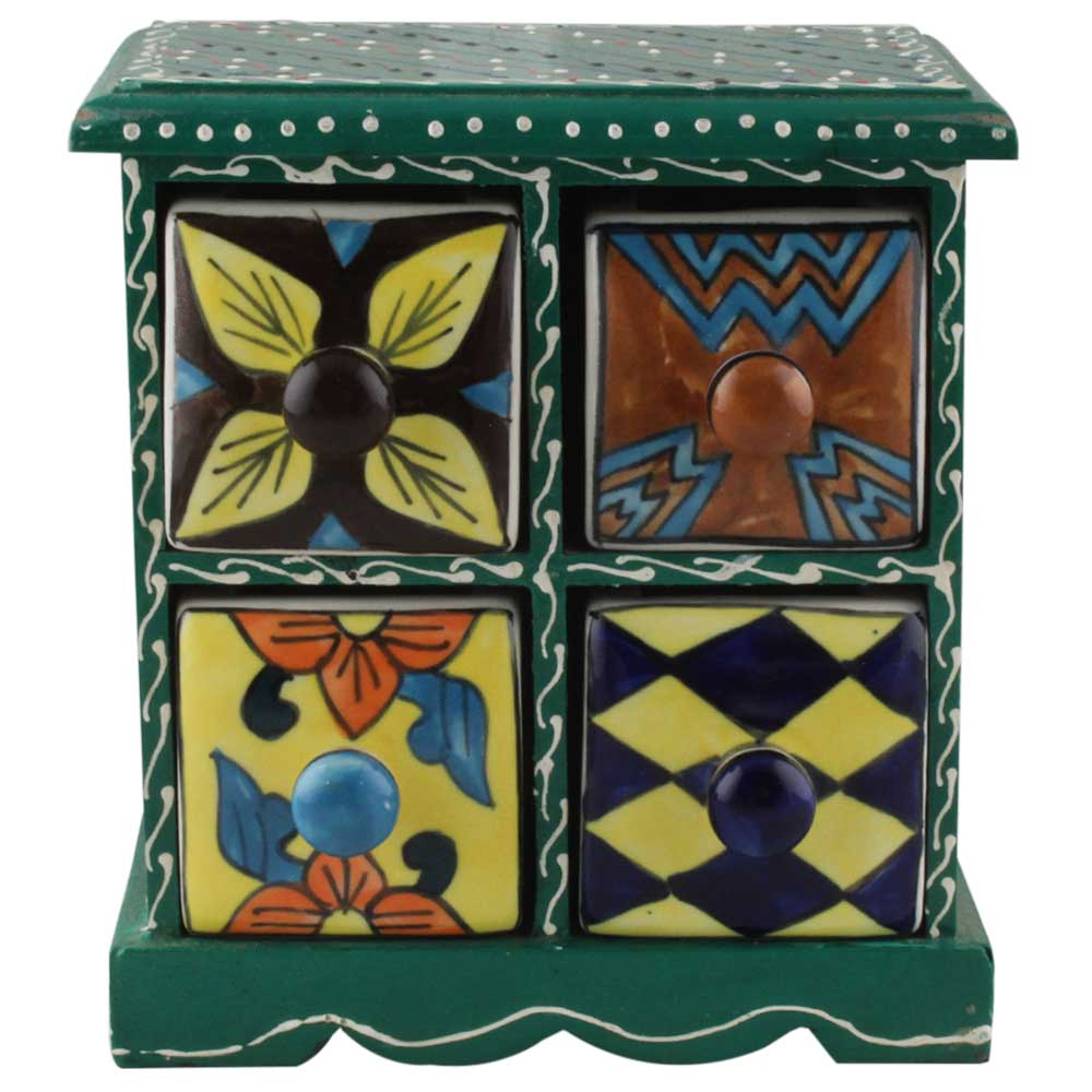Spice Box-1231 Masala Rack Container Gift Item. Ceramic Drawers in Wooden Frame. The Spice Boxes are designed with different patterns. These boxes are made using natural wood which does not harm the purity of spices.