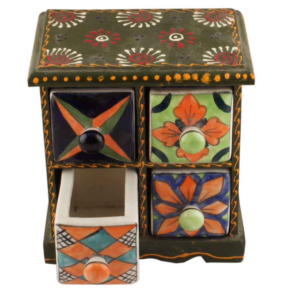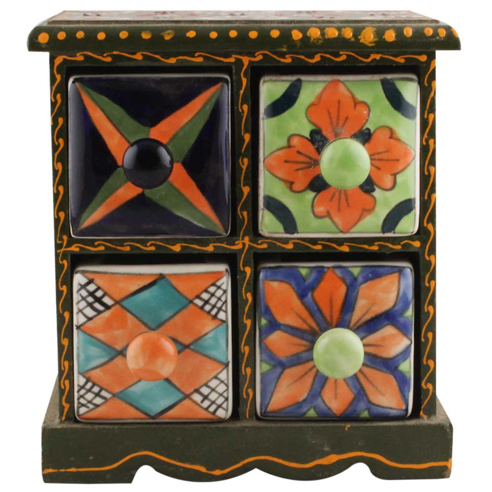 Spice Box-1244 Masala Rack Container Gift Item. Ceramic Drawers in Wooden Frame. The Spice Boxes are designed with different patterns. These boxes are made using natural wood which does not harm the purity of spices.