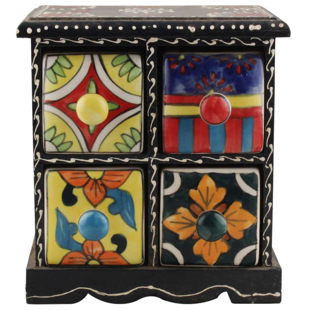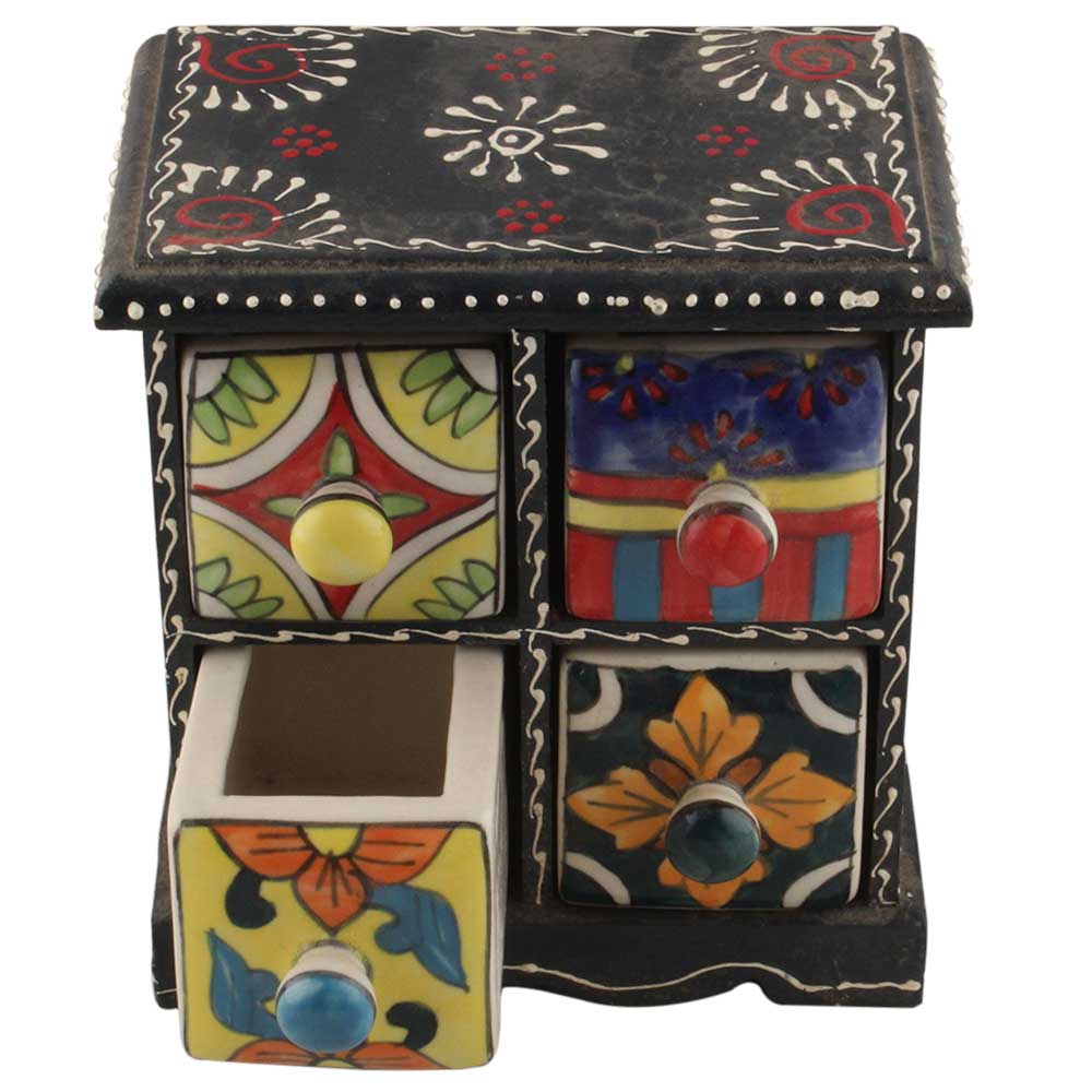 Spice Box-1258 Masala Rack Container Gift Item. Ceramic Drawers in Wooden Frame. The Spice Boxes are designed with different patterns. These boxes are made using natural wood which does not harm the purity of spices.