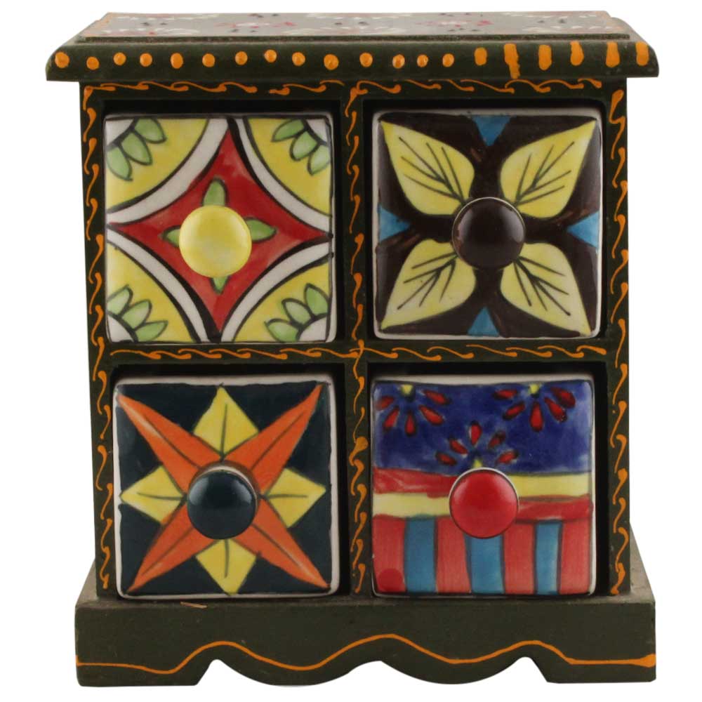 Spice Box-1266 Masala Rack Container Gift Item. Ceramic Drawers in Wooden Frame. The Spice Boxes are designed with different patterns. These boxes are made using natural wood which does not harm the purity of spices.