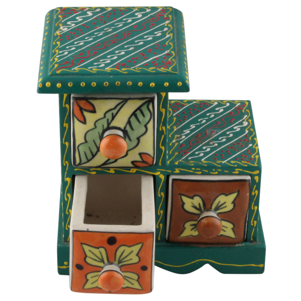 Spice Box-1293 Masala Rack Container Gift Item. Ceramic Drawers in Wooden Frame. The Spice Boxes are designed with different patterns. These boxes are made using natural wood which does not harm the purity of spices.