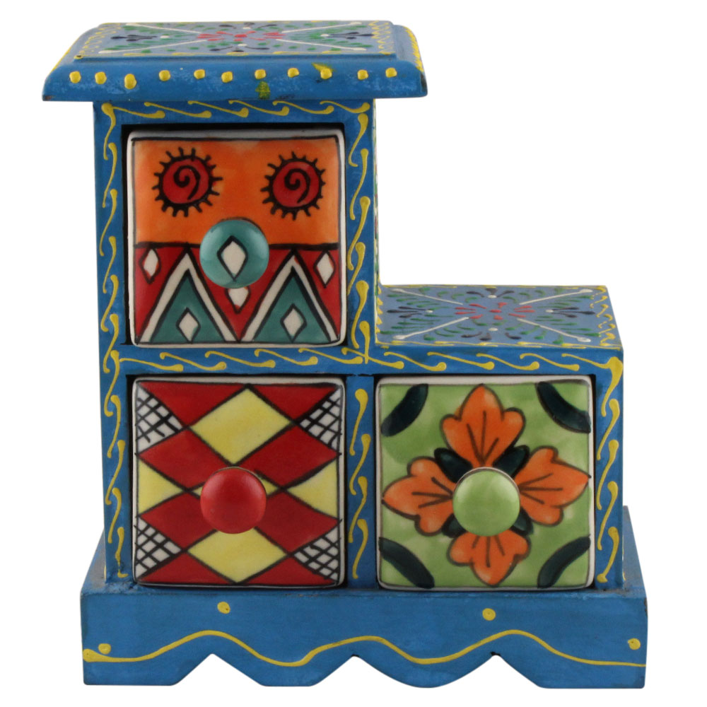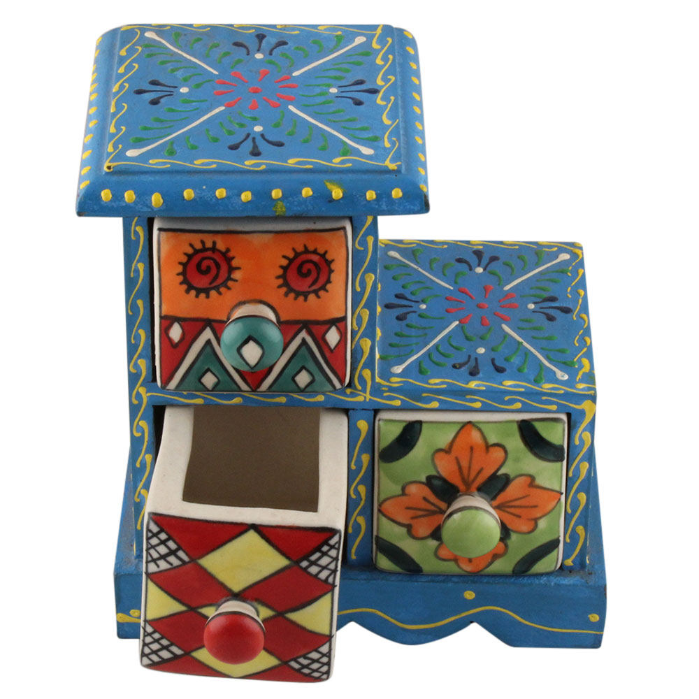 Spice Box-1295 Masala Rack Container Gift Item. Ceramic Drawers in Wooden Frame. The Spice Boxes are designed with different patterns. These boxes are made using natural wood which does not harm the purity of spices.