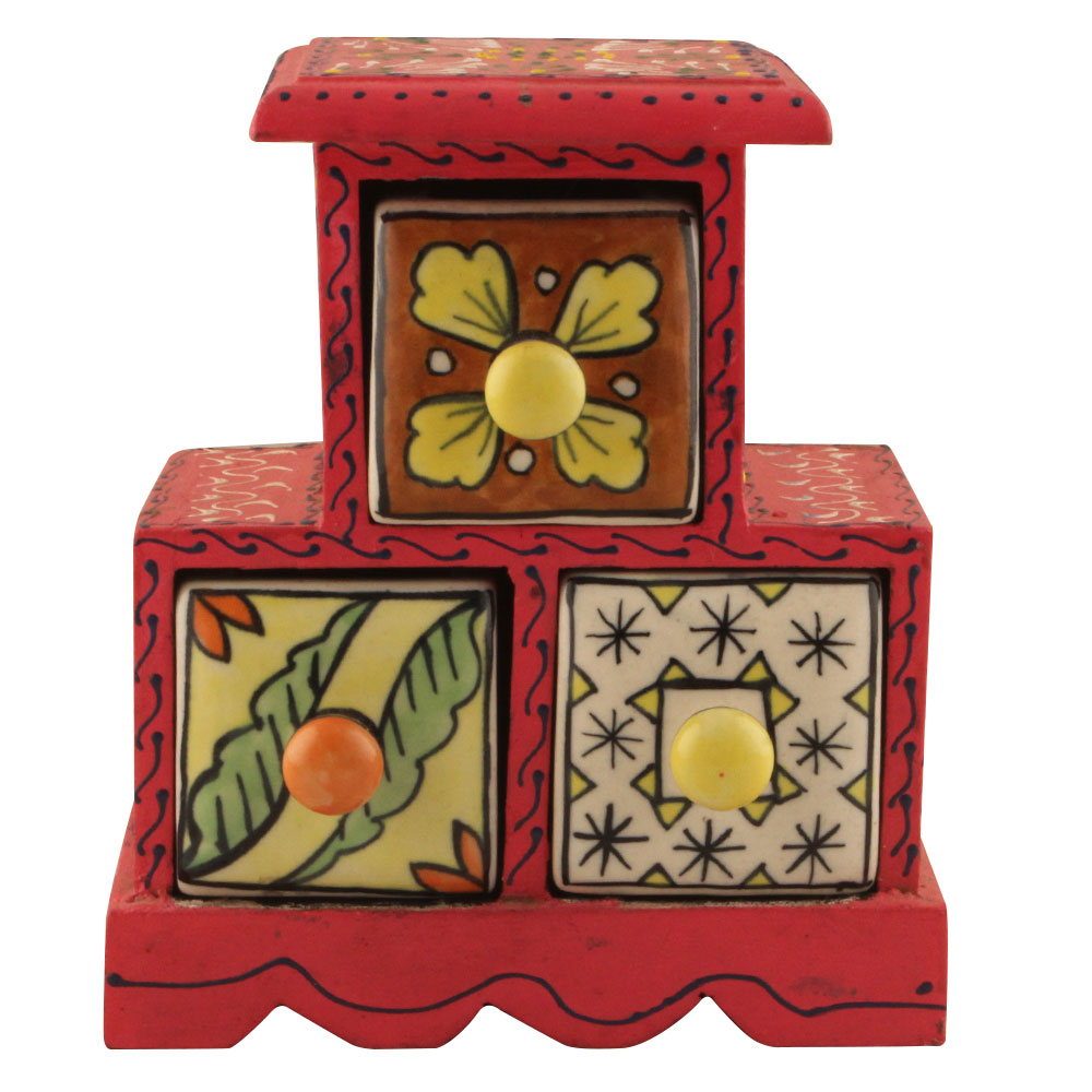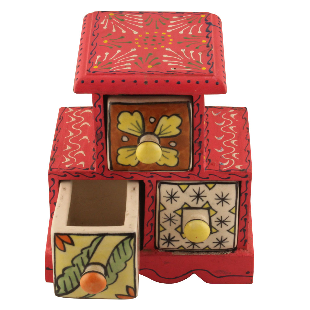 Spice Box-1310 Masala Rack Container Gift Item. Ceramic Drawers in Wooden Frame. The Spice Boxes are designed with different patterns. These boxes are made using natural wood which does not harm the purity of spices.