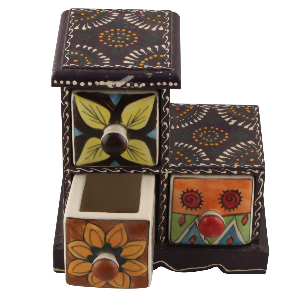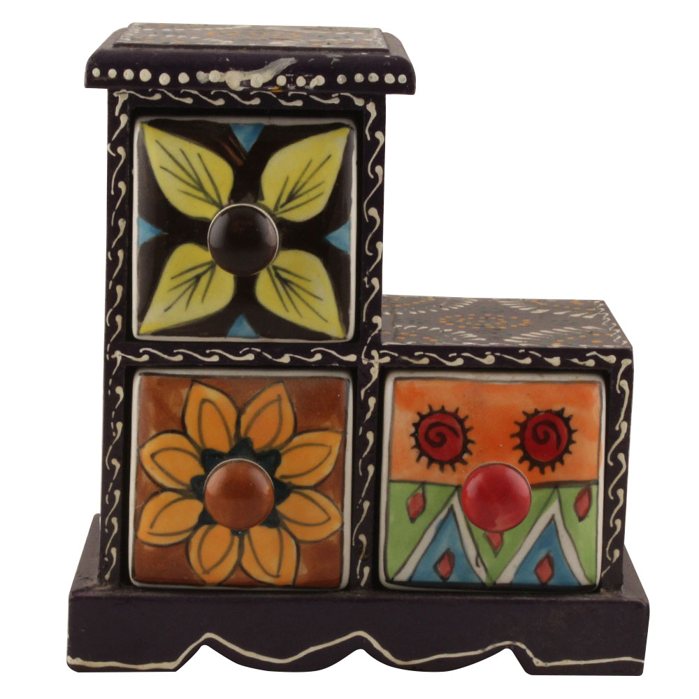 Spice Box-1314 Masala Rack Container Gift Item. Ceramic Drawers in Wooden Frame. The Spice Boxes are designed with different patterns. These boxes are made using natural wood which does not harm the purity of spices.