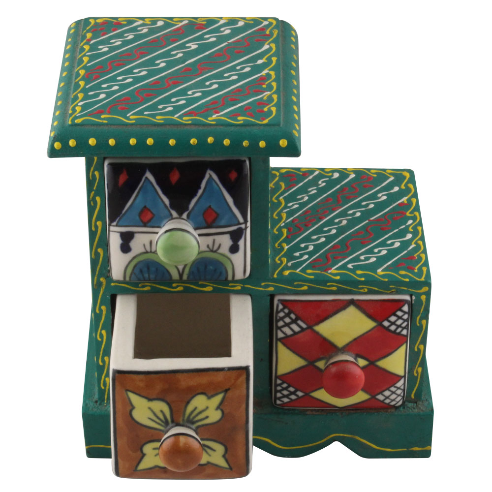 Spice Box-1317 Masala Rack Container Gift Item. Ceramic Drawers in Wooden Frame. The Spice Boxes are designed with different patterns. These boxes are made using natural wood which does not harm the purity of spices.