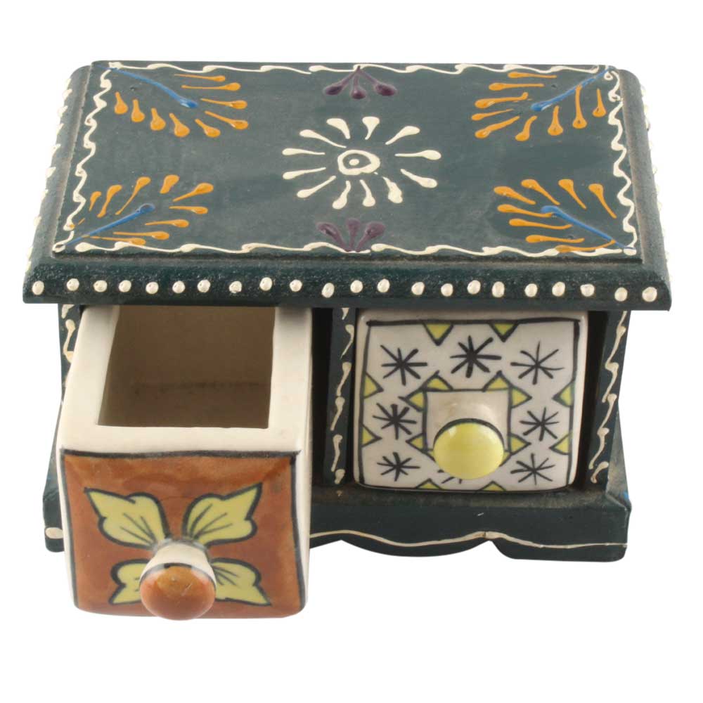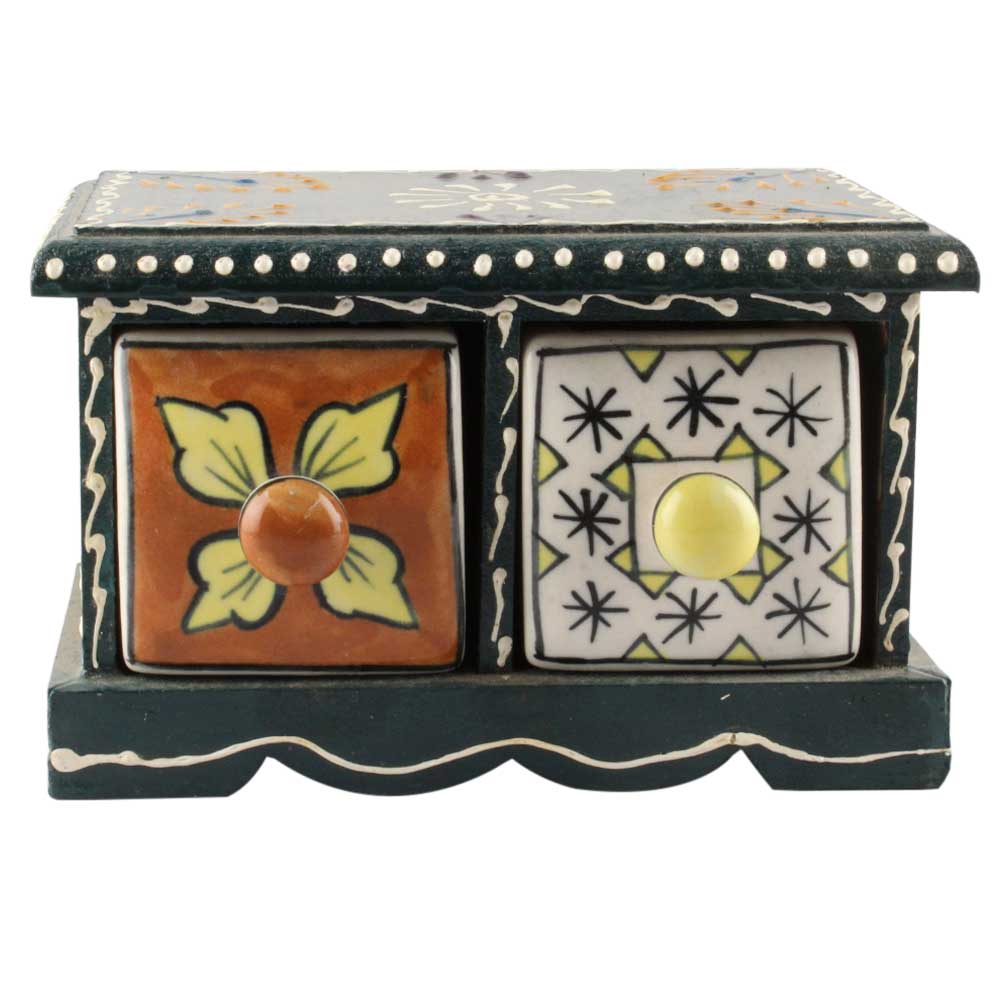 Spice Box-1344 Masala Rack Container Gift Item. Ceramic Drawers in Wooden Frame. The Spice Boxes are designed with different patterns. These boxes are made using natural wood which does not harm the purity of spices.