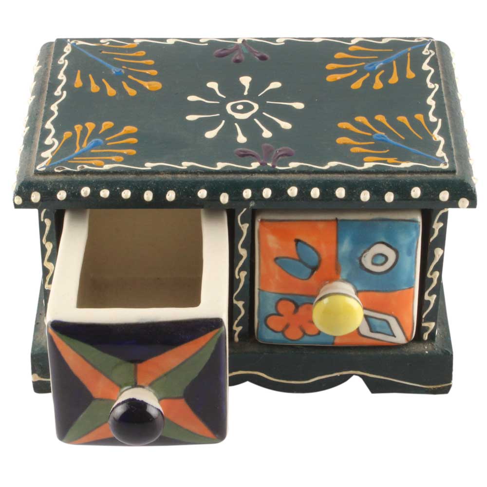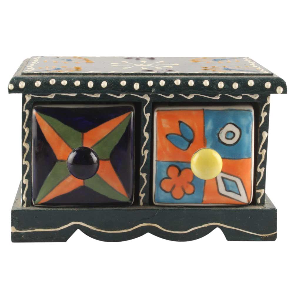 Spice Box-1346 Masala Rack Container Gift Item. Ceramic Drawers in Wooden Frame. The Spice Boxes are designed with different patterns. These boxes are made using natural wood which does not harm the purity of spices.