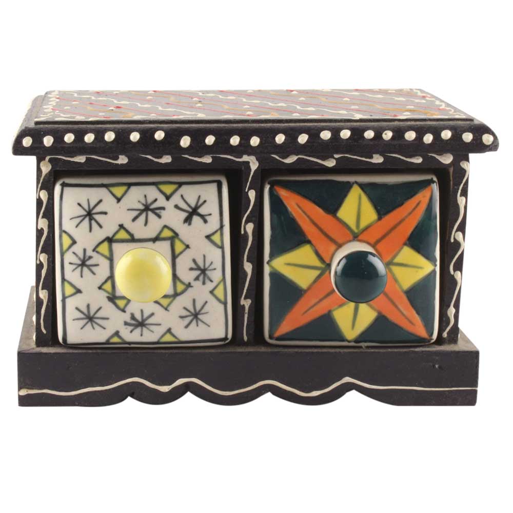 Spice Box-1347 Masala Rack Container Gift Item. Ceramic Drawers in Wooden Frame. The Spice Boxes are designed with different patterns. These boxes are made using natural wood which does not harm the purity of spices.