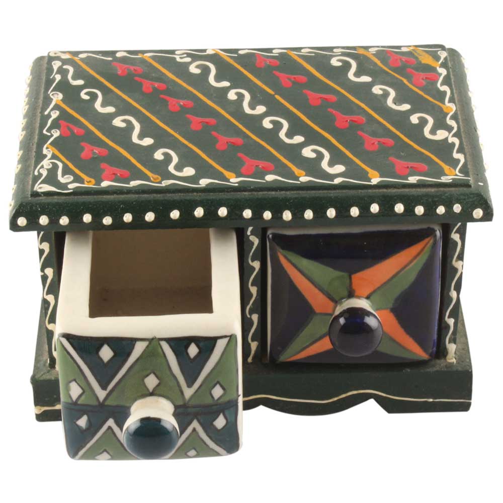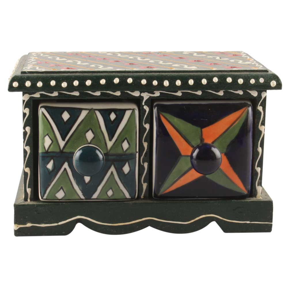 Spice Box-1351 Masala Rack Container Gift Item. Ceramic Drawers in Wooden Frame. The Spice Boxes are designed with different patterns. These boxes are made using natural wood which does not harm the purity of spices.