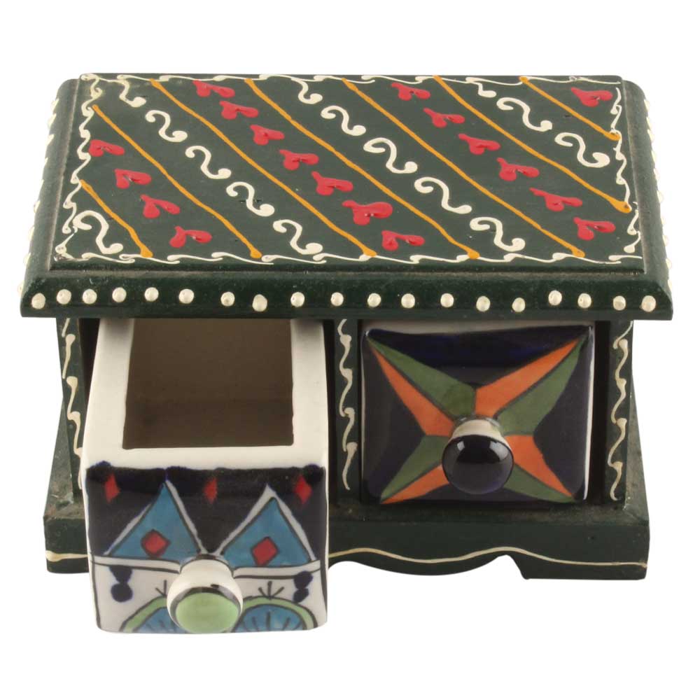Spice Box-1355 Masala Rack Container Gift Item. Ceramic Drawers in Wooden Frame. The Spice Boxes are designed with different patterns. These boxes are made using natural wood which does not harm the purity of spices.