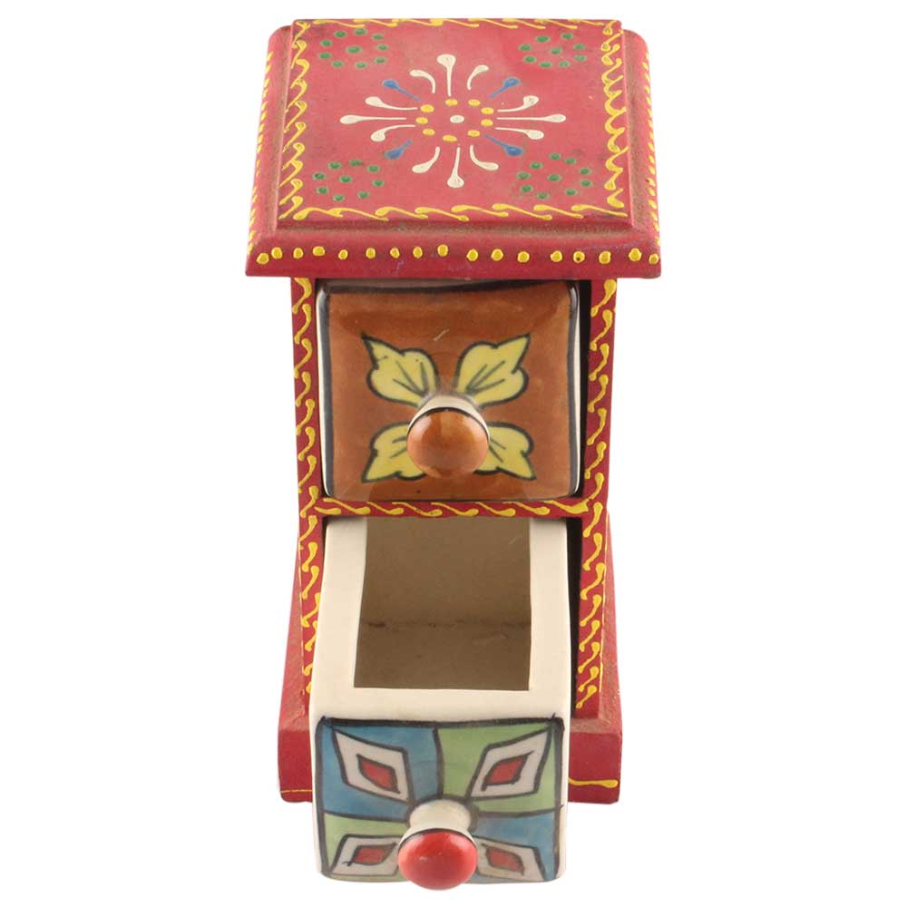 Spice Box-1368 Masala Rack Container Gift Item. Ceramic Drawers in Wooden Frame. The Spice Boxes are designed with different patterns. These boxes are made using natural wood which does not harm the purity of spices.