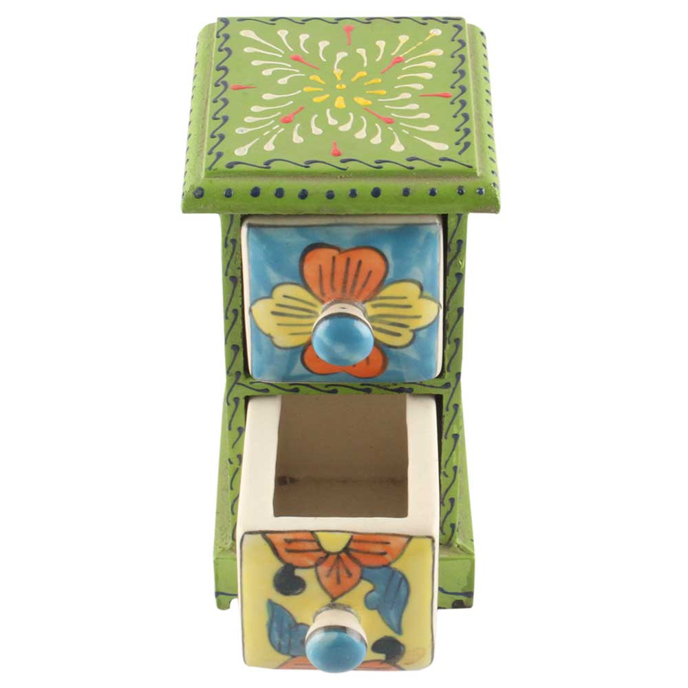 Spice Box-1369 Masala Rack Container Gift Item. Ceramic Drawers in Wooden Frame. The Spice Boxes are designed with different patterns. These boxes are made using natural wood which does not harm the purity of spices.
