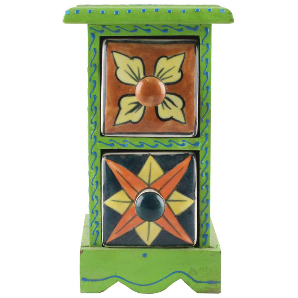 Spice Box-1373 Masala Rack Container Gift Item. Ceramic Drawers in Wooden Frame. The Spice Boxes are designed with different patterns. These boxes are made using natural wood which does not harm the purity of spices.