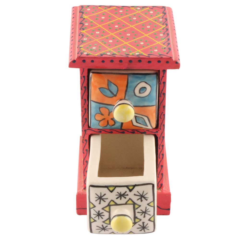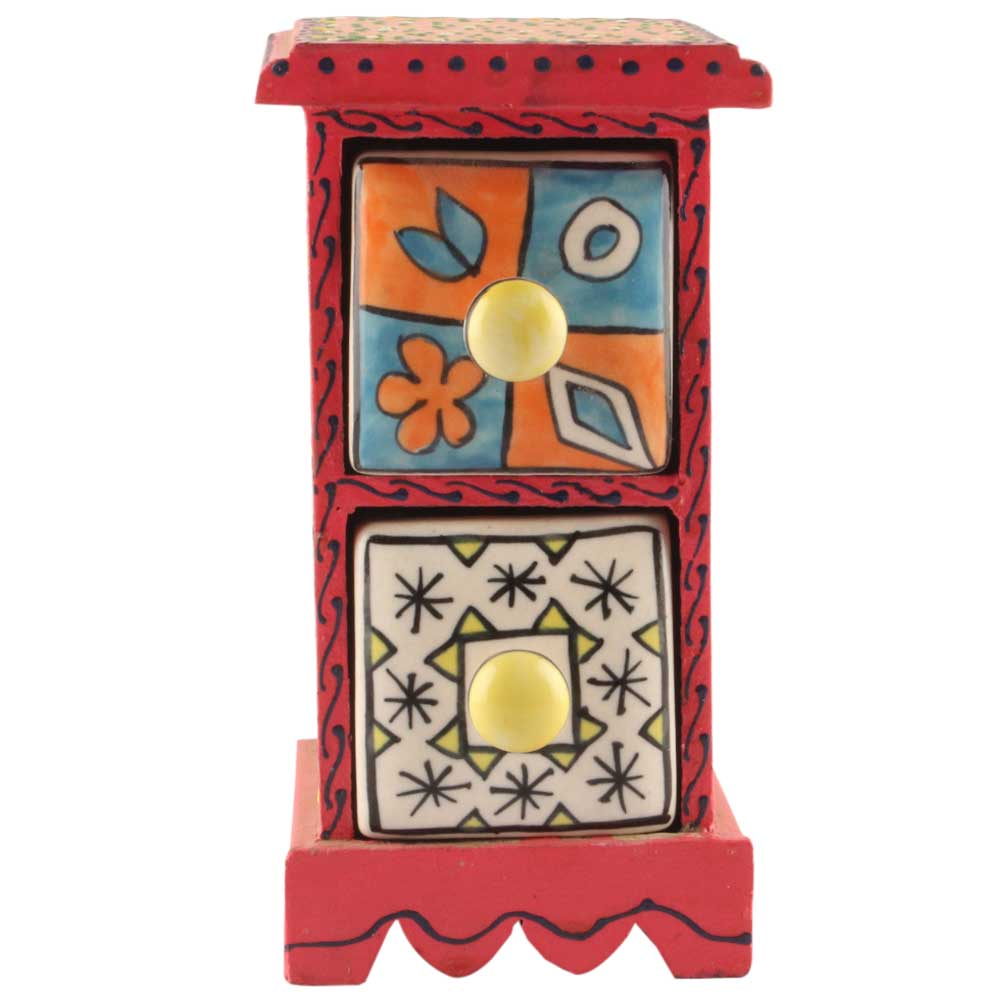 Spice Box-1395 Masala Rack Container Gift Item. Ceramic Drawers in Wooden Frame. The Spice Boxes are designed with different patterns. These boxes are made using natural wood which does not harm the purity of spices.