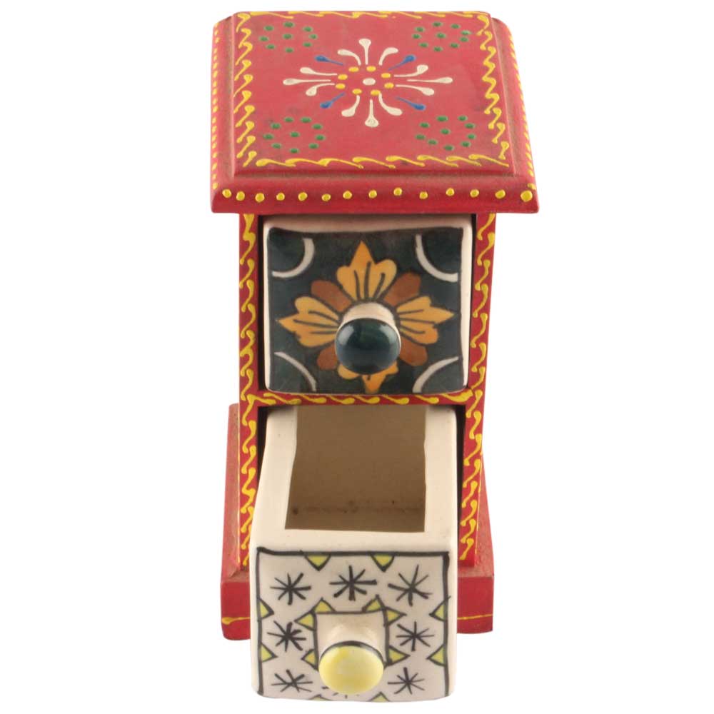 Spice Box-1405 Masala Rack Container Gift Item. Ceramic Drawers in Wooden Frame. The Spice Boxes are designed with different patterns. These boxes are made using natural wood which does not harm the purity of spices.