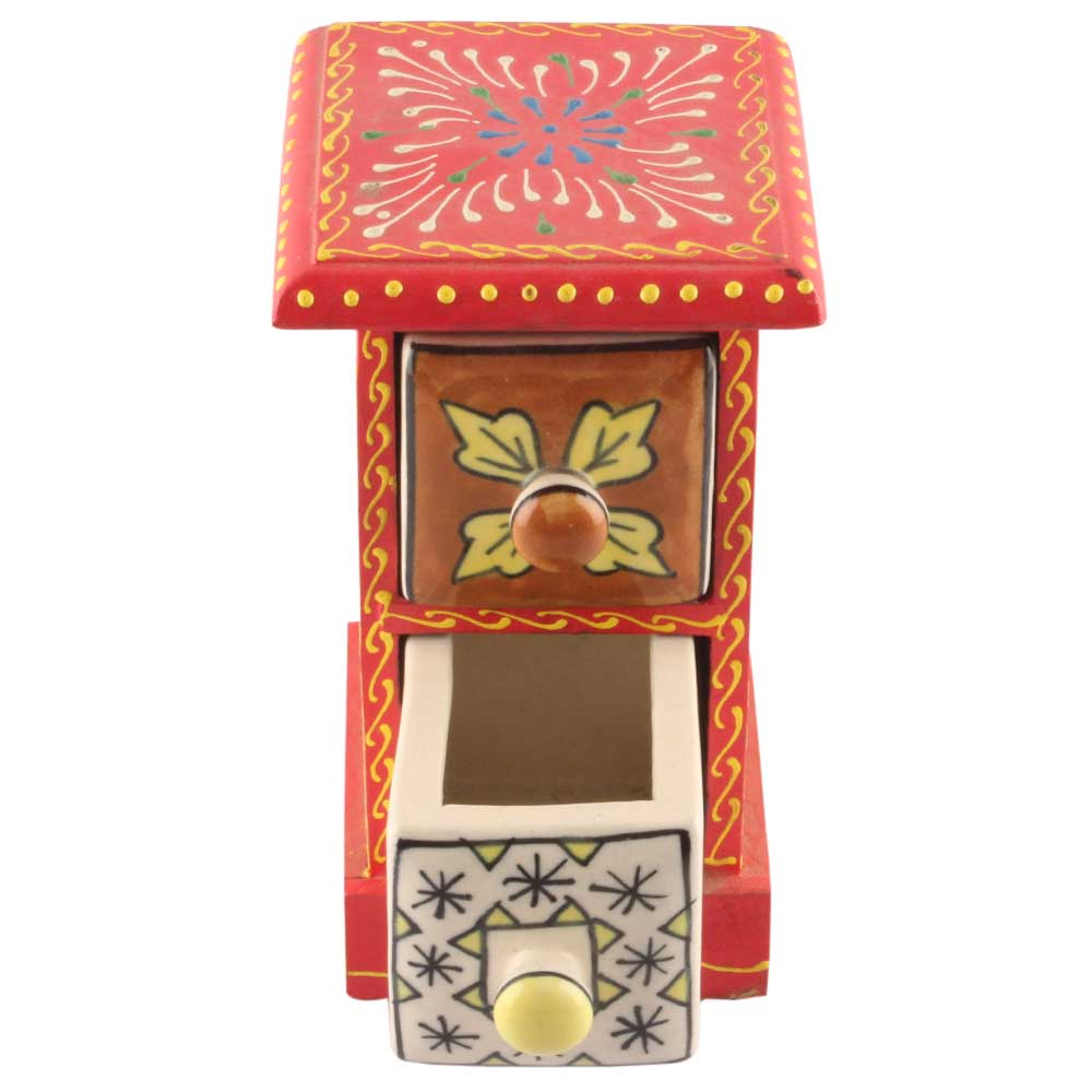 Spice Box-1406 Masala Rack Container Gift Item. Ceramic Drawers in Wooden Frame. The Spice Boxes are designed with different patterns. These boxes are made using natural wood which does not harm the purity of spices.