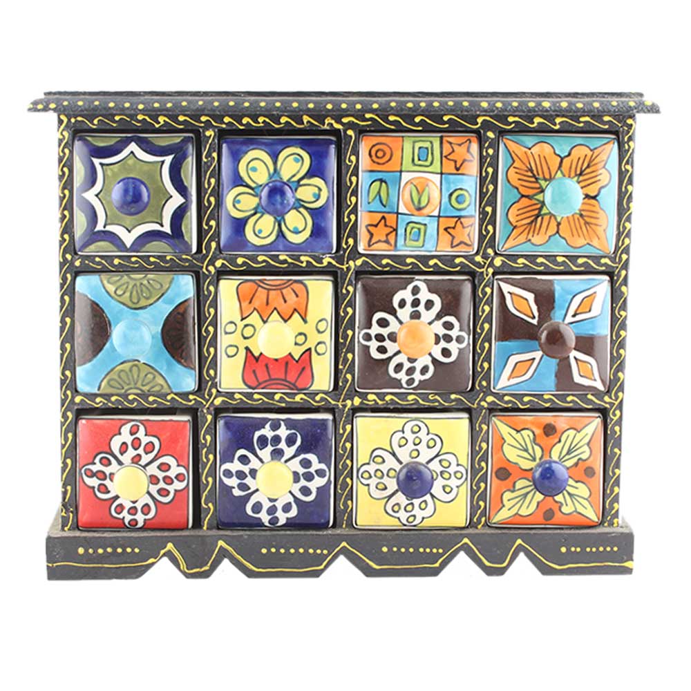 Spice Box-826 Masala Rack Container Gift Item. Ceramic Drawers in Wooden Frame. The Spice Boxes are designed with different patterns. These boxes are made using natural wood which does not harm the purity of spices.