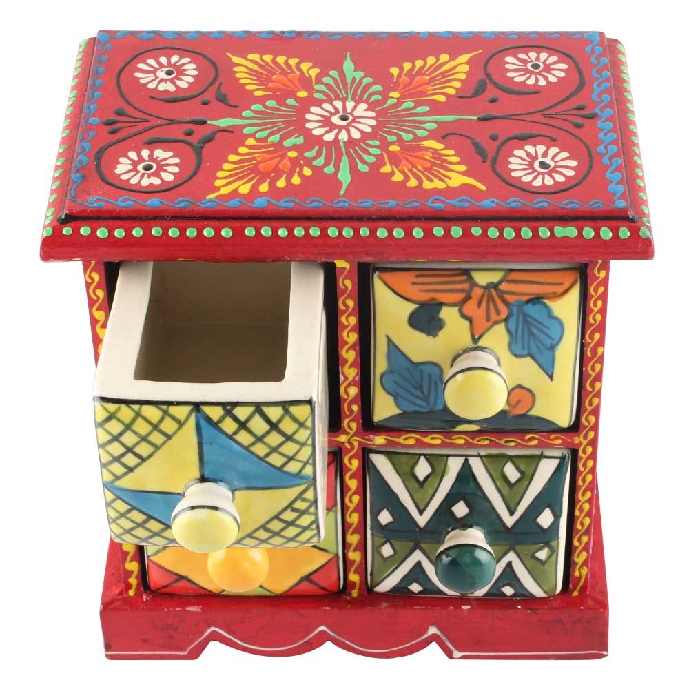 Spice Box-927 Masala Rack Container Gift Item. Ceramic Drawers in Wooden Frame. The Spice Boxes are designed with different patterns. These boxes are made using natural wood which does not harm the purity of spices.