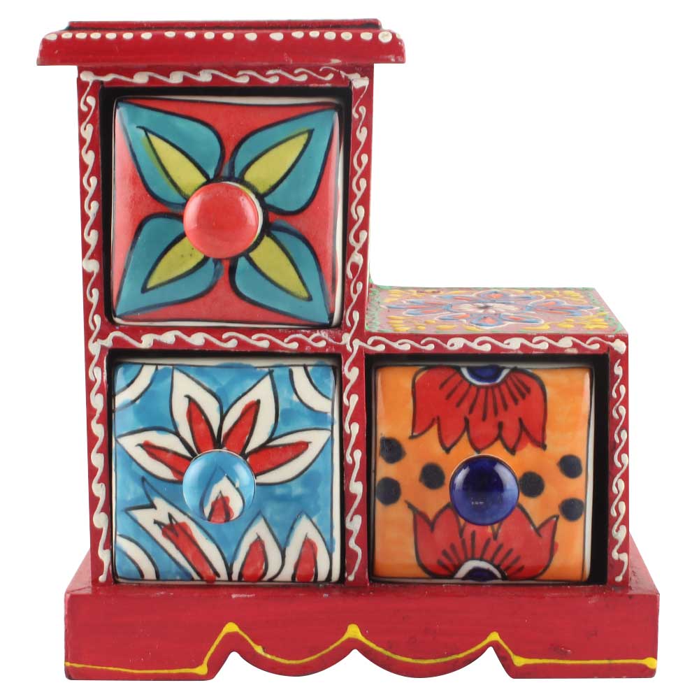 Spice Box-966 Masala Rack Container Gift Item. Ceramic Drawers in Wooden Frame. The Spice Boxes are designed with different patterns. These boxes are made using natural wood which does not harm the purity of spices.