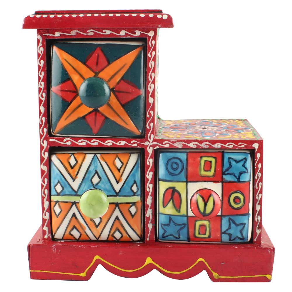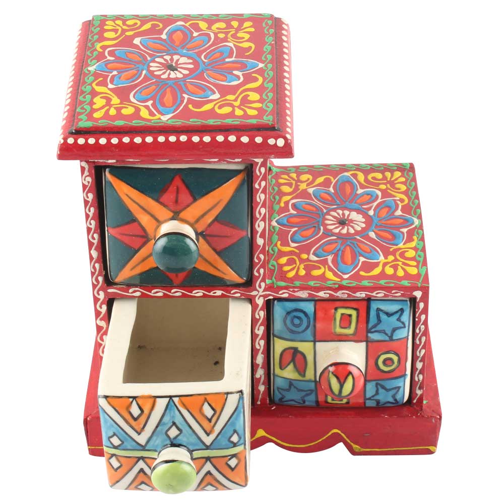 Spice Box-967 Masala Rack Container Gift Item. Ceramic Drawers in Wooden Frame. The Spice Boxes are designed with different patterns. These boxes are made using natural wood which does not harm the purity of spices.
