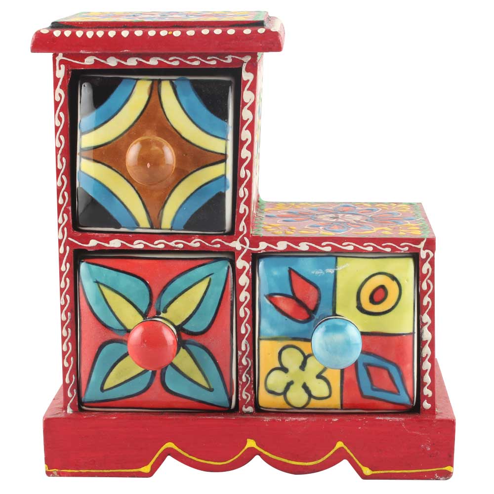 Spice Box-970 Masala Rack Container Gift Item. Ceramic Drawers in Wooden Frame. The Spice Boxes are designed with different patterns. These boxes are made using natural wood which does not harm the purity of spices.
