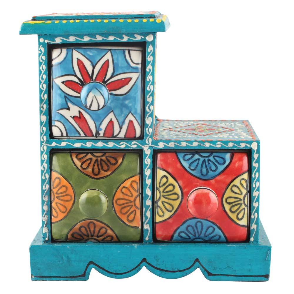 Spice Box-972 Masala Rack Container Gift Item. Ceramic Drawers in Wooden Frame. The Spice Boxes are designed with different patterns. These boxes are made using natural wood which does not harm the purity of spices.