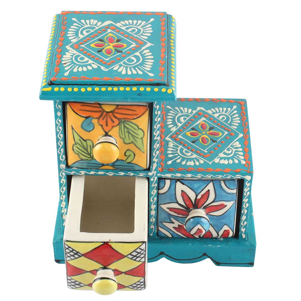 Spice Box-978 Masala Rack Container Gift Item. Ceramic Drawers in Wooden Frame. The Spice Boxes are designed with different patterns. These boxes are made using natural wood which does not harm the purity of spices.